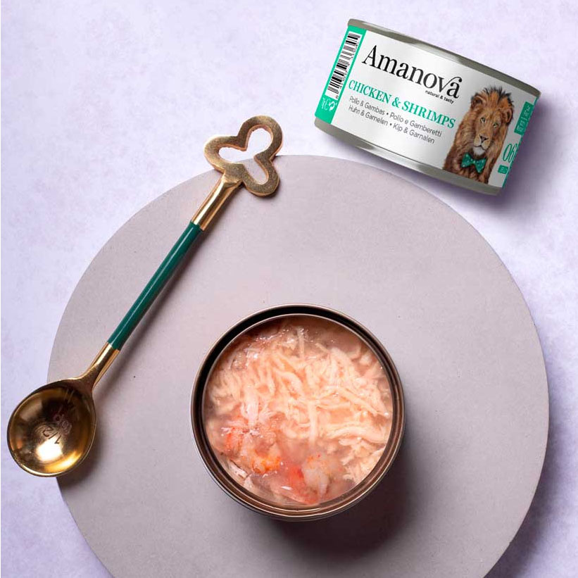 Ta receptura to karma uzupełniająca, którą można spożywać razem z pełnoporcjową karmą Amanova. Kurczak, jako źródło tauryny, wspomaga zdrowie oczu, a krewetki dostarczają minerałów, które wspomagają utrzymanie optymalnego stanu kości. Aby koty były szczęśliwsze i z