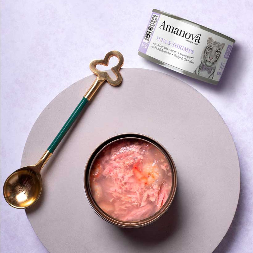 Ta uzupełniająca karma dla zwierząt idealnie nadaje się do podawania z pełnoporcjową karmą Amanova, aby utrzymać zdrową i zbilansowaną dietę. Tuńczyk i krewetki są bogate w białko i łatwostrawne, zawierają niezbędne minerały, które wspomagają zdrowie kości, a także kwasy tłuszczowe omega-3 dla zdrowej skóry i sierści. Gdyby koty umiały mówić, zawsze prosiłyby o Amanovę!