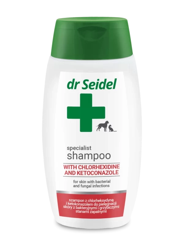 Specjalistyczny skoncentrowany szampon dr Seidla z chlorheksydyną i ketokonazolem to doskonały preparat do pielęgnacji skóry zwierząt podczas terapii stanów zapalnych skóry wywołanych: zakażeniami bakteriami gram-dodatnimi i gram-ujemnymi oraz zakażeniami grzybiczymi (w tym drożdżakami). Przyczynia się również do redukcji świądu. Zawiera łagodne środki myjące oraz hydrolizowaną keratynę. Nie zawiera barwników i substancji zapachowych.