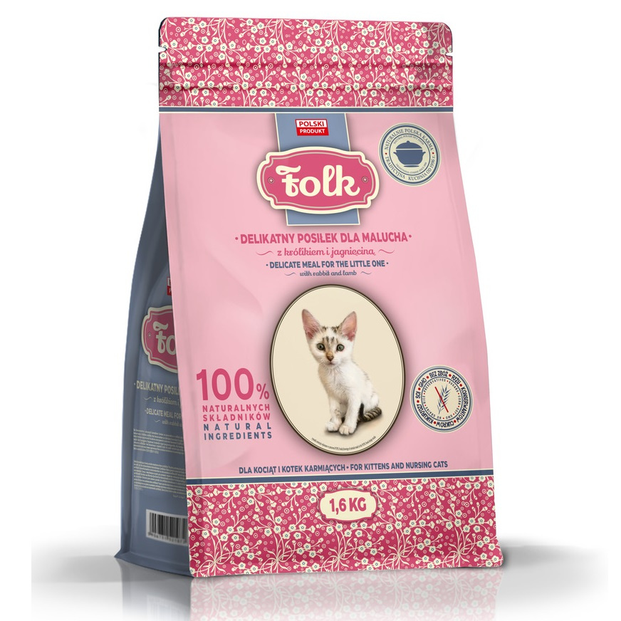 Karma sucha FOLK Delikatny posiłek dla malucha z królikiem i jagnięciną 1,6 kg to doskonały wybór na pierwszy pokarm stały małego kotka. Idealny bilans wysokowartościowego białka i tłuszczu, pochodzących z delikatnego mięsa królika oraz soczystej jagnięciny zapewniają prawidłowy wzrost i rozwój malucha.