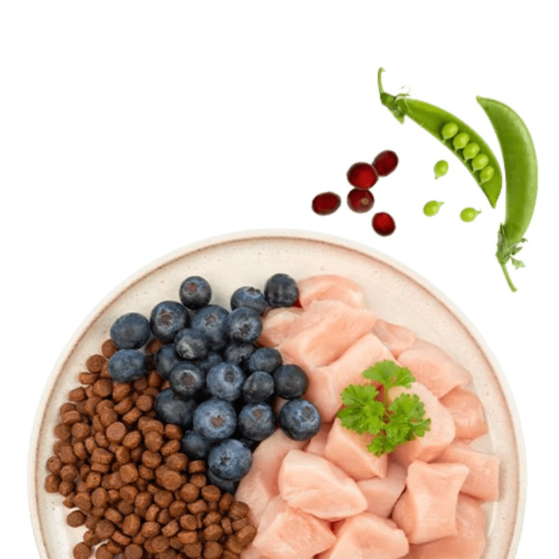 Skład: Świeże mięso z kurczaka (25%), kukurydza, jęczmień, białko drobiowe (suszone), tłuszcz zwierzęcy, białko kukurydziane, hydrolizat białka, siemię lniane, węglan wapnia, ryż (1%), mączka wątrobowa, groch (suszony, 0,4%), borówki brusznice (suszone, 0,1%), borówki (suszone, 0,1%), suszona pietruszka (0,1%), drożdże (suszone, 0,1%), chlorek potasu, kwiaty nagietka (suszone, 0,05%).