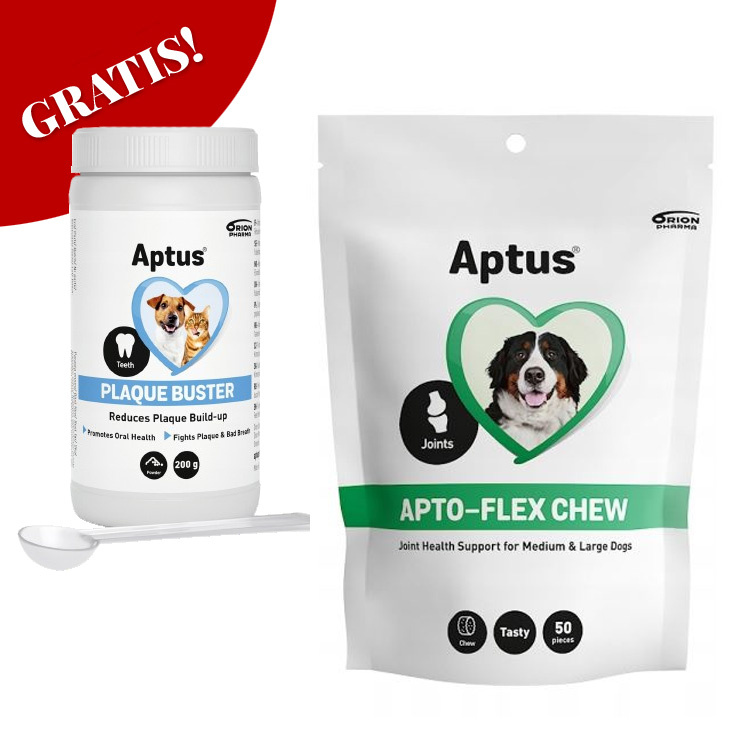 Zaleca się podwojenie dawki w trakcie pierwszych 4 – 6 tygodni stosowania lub w razie potrzeby. Apto-Flex Chew™ jest polecany dla psów powyżej 15 kg. Dla psów do 15 kg oraz kotów poleceny jest Aptus® Apto-Flex Chew Mini™. Zawsze stosuj się do zaleceń lekarza weterynarii.