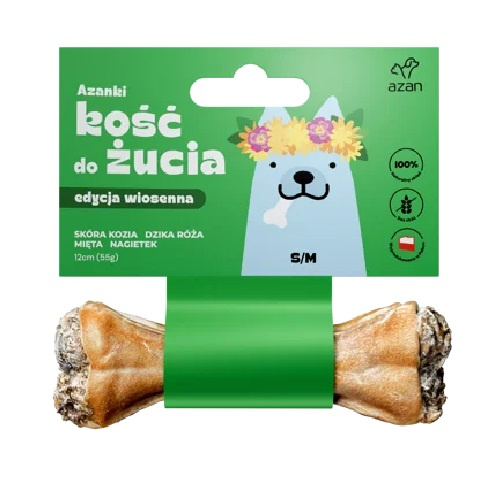 - Kość do żucia S/M w skórze wołowej ze skórą kozią, miętą, dziką różą i nagietkiem 12cm x1