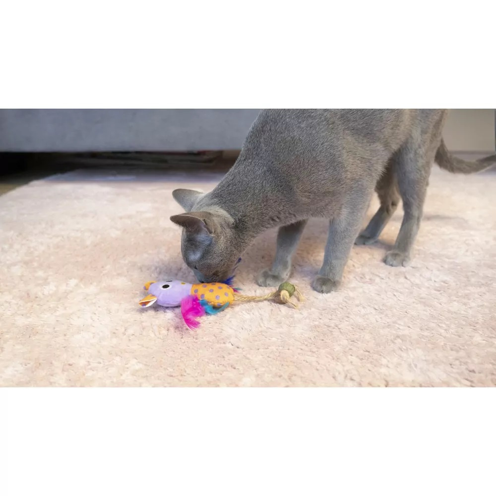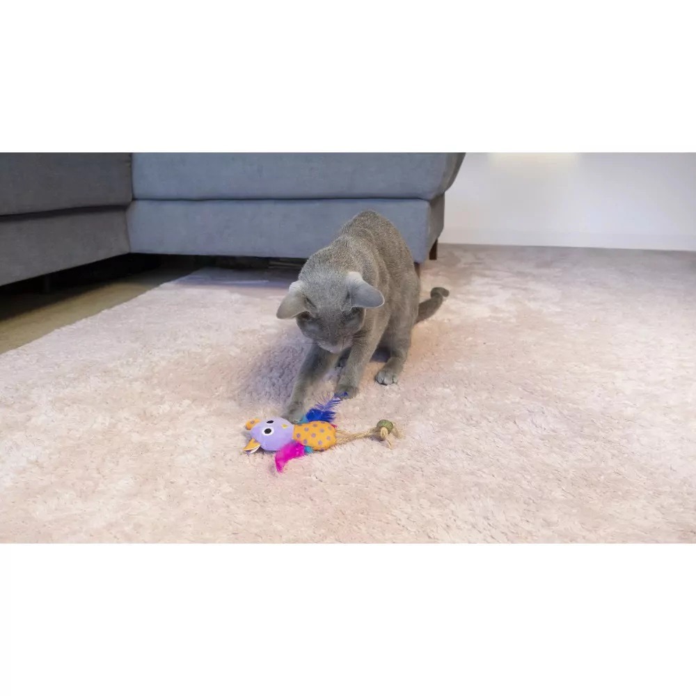 - Pluszowy ptak z piórkami i sznurkami zakończonymi kocimiętką i matatabi