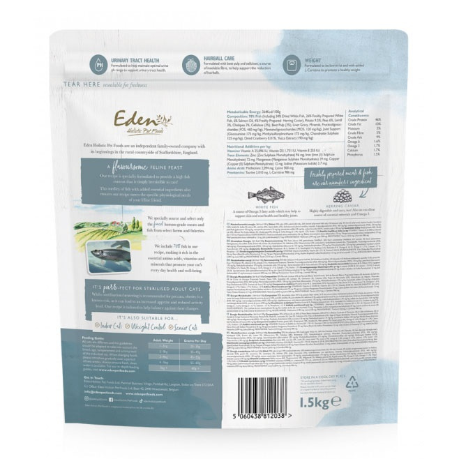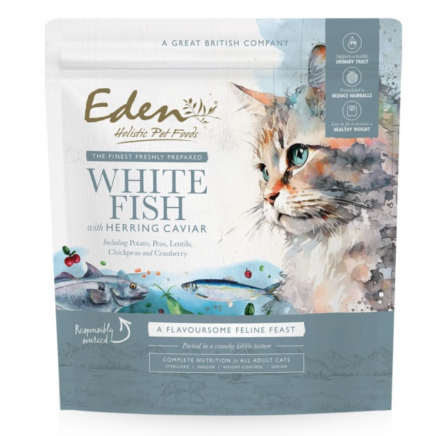 Eden Biała Ryba i Kawior ze Śledzia – Karma sucha pełnoporcjowa dla kotów dorosłych, seniorów, kotów z nadwagą, 1,5kg