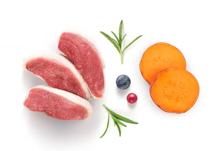 - Świeże mięso bez kości z kaczki (26%), Dehydratyzowane mięso z indyka (24%), Słodki Ziemniak, Groszek, Ziemniaka, Sproszkowany susz z korzenia cykorii (naturalne źródło FOS i inuliny), Siemię lniane, Minerały, Tłuszcz z indyka (1%), Drożdże piwne (naturalne źródło MOS i beta-glukanów), Olej z łososia (1%), Jabłka, Marchew, Żurawina, Jagody, Brokuły, Szpinak, Pomidory, Chlorowodorek glukozaminy (100 mg/kg), Siarczan chondroityny (100 mg/kg), Yukka Shidiger, Owoce cytrusowe, Rozmaryn, Kurkuma