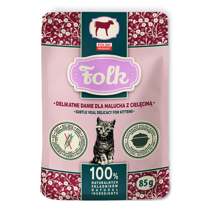 Karma FOLK dzięki odpowiednio skomponowanej przez naukowców z Pupil Instytutu Żywienia Zwierząt recepturze i wyjątkowemu smakowi jest najlepszą alternatywą dla rozpoczęcia żywienia pokarmem stałym kociąt. Całkowicie bezzbożowa receptura, bazująca na cielęcym mięsie, zmniejsza ryzyko wystąpienia reakcji alergicznych. Posiłek ten zapewnia więc zwierzęciu odpowiednią ilość energii, nie obciążając przy tym układu trawiennego, co sprawia, że to doskonały posiłek zarówno dla młodego kotka, jak i jego osłabionej ciążą i laktacją mamy.