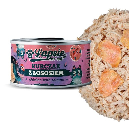 ŁAPSIE FOR CAT MOKRA KARMA DLA KOTA KURCZAK Z ŁOSOSIEM W BULIONIE PUSZKA 12x80g