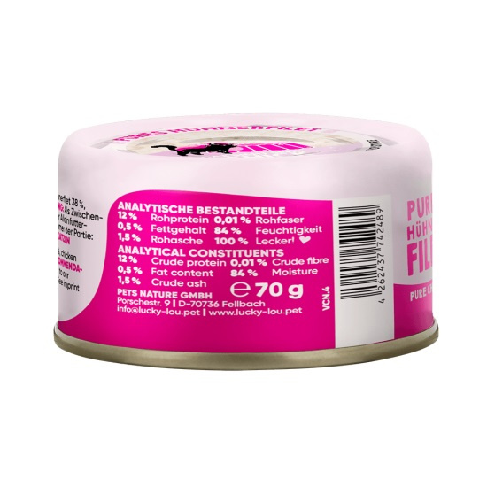 Lucky Lou Extrafood nie zawiera w sobie żadnych zbóż, glutenu, cukru i sztucznych dodatków. Jest za to pełna smakowitego mięsa, ryb i bulionu lub galaretki. Z tym przepysznym dodatkiem możesz rozpieszczać swojego mruczka każdego dnia!
