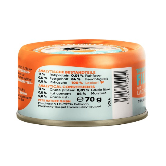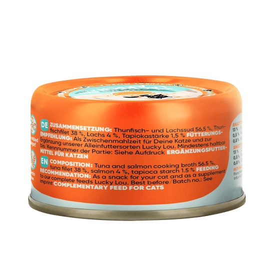 Karma uzupełniająca Premium - Lucky Lou Extrafood, soczysty tuńczyk i łosoś w bulionie, puszka 70g
