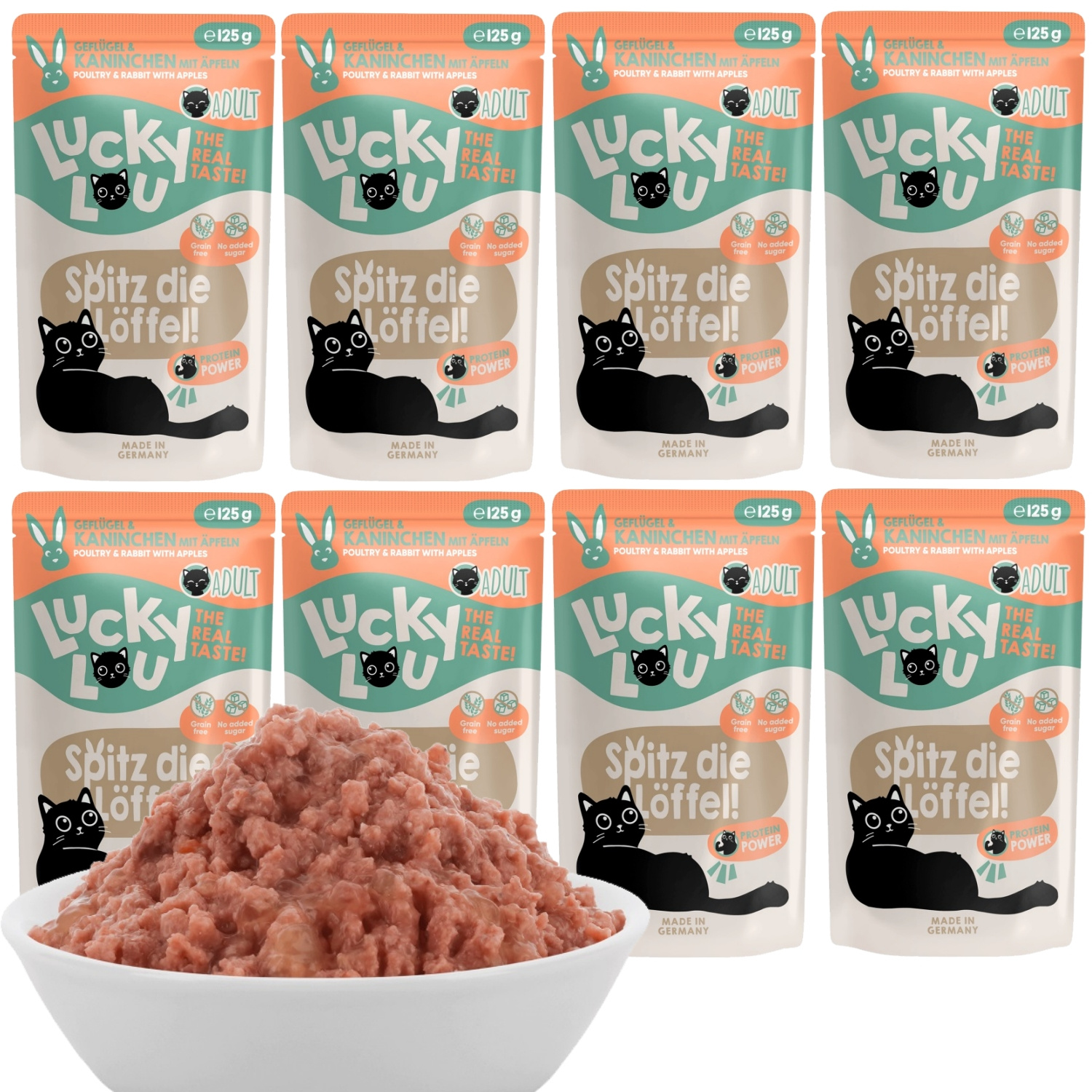 Karma pełnoporcjowa dla dorosłych kotów Lucky Lou Lifestage, Drób i Królik, 8 saszetek po 125g