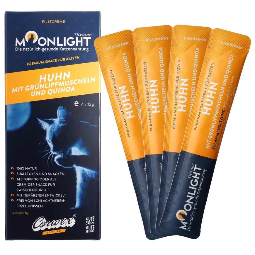 Przysmaki dla kota Moonlight Dinner Kurczak z omułkiem zielonowargowym i komosą ryżową, 4 saszetki po 15g