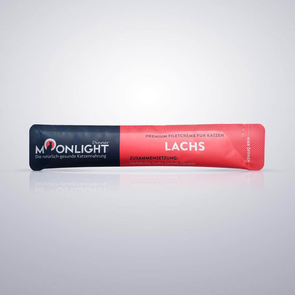 Przysmaki dla kota Moonlight Dinner Mus z Łososia są bogate w kwasy Omega 3, a to za sprawą morskiej ryby – łososia oraz oleju z łososia. Dzięki temu Twój kot będzie maił lśniącą sierść i zdrową skórę. Nie zawierają zbóż ani glutenu. Lekkostrawne biało ryby nie podrażnia układu pokarmowego kota, za to zapach łososia pobudza kubki smakowe. W pudełku są 4 saszetki pełne kremowego musu z łososia. Spokojnie, przy wadze kota ok 3 kg możesz podać od 1 do 4 saszetek dziennie. Każda saszetka ma 15 g.