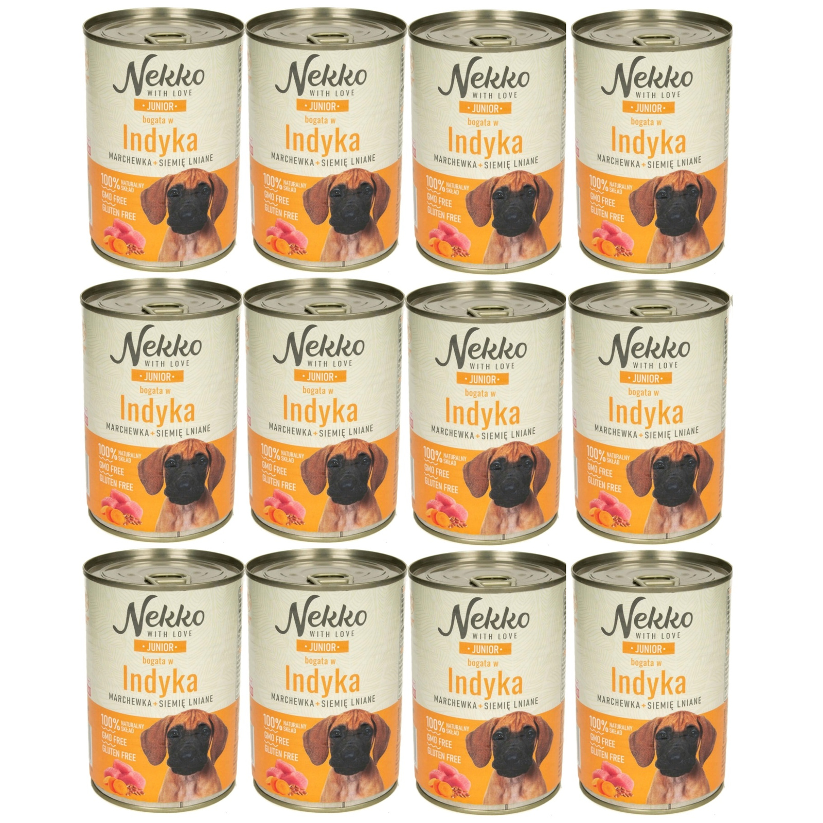 Zestaw 12x400g - Nekko Junior, mokra karma w puszce dla szczeniąt, Bogata w Indyka z marchewką i siemieniem lnianym.