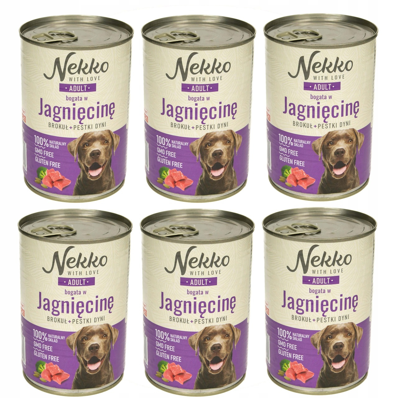 Zestaw 6x400g - Nekko Adult, mokra karma w puszce dla dorosłych psów, Bogata w Jagnięcinę z brokułami i pestkami dyni.