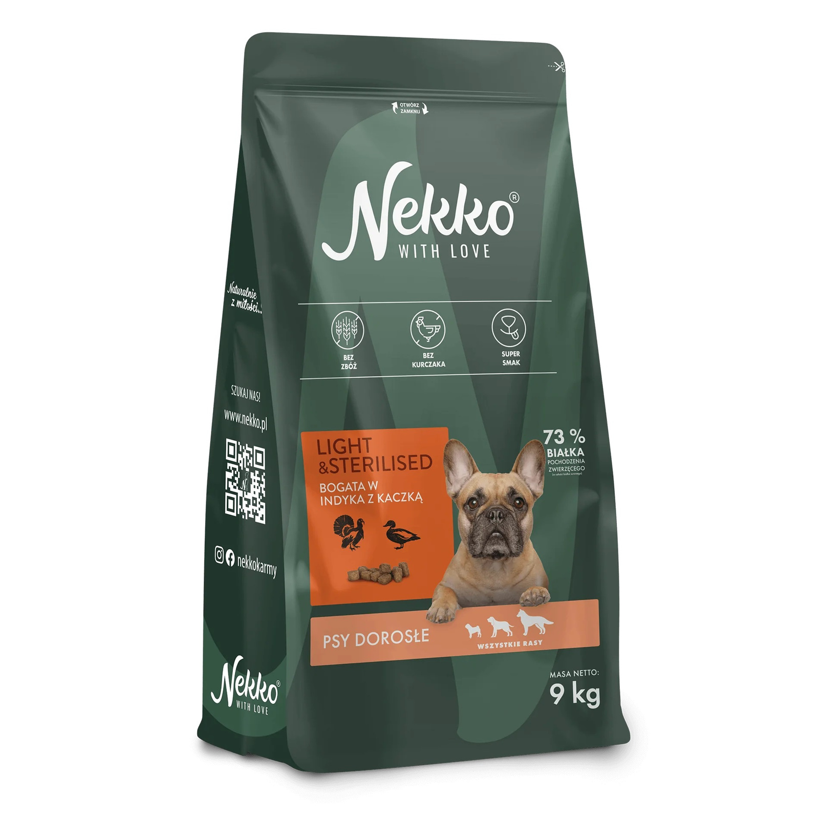 NEKKO karma sucha bezzbożowa, psy dorosłe wszystkie rasy, Light&Sterilised, bogata w indyka z kaczką, 9kg