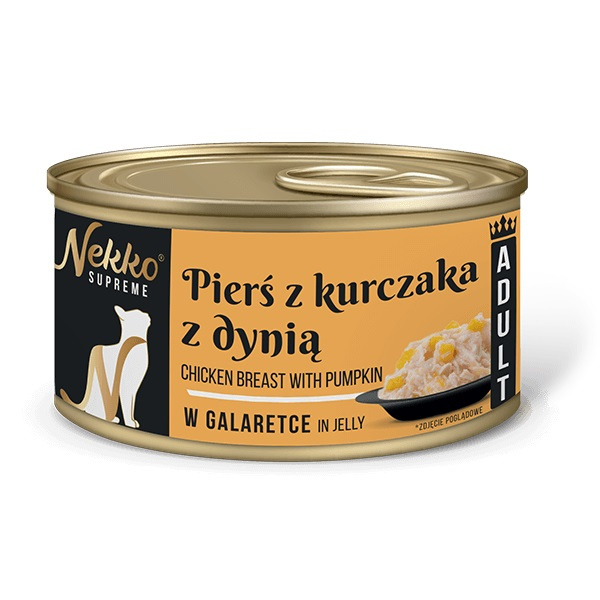 - Skład: Pierś z kurczaka 50%, dynia 5%, środek żelujący.