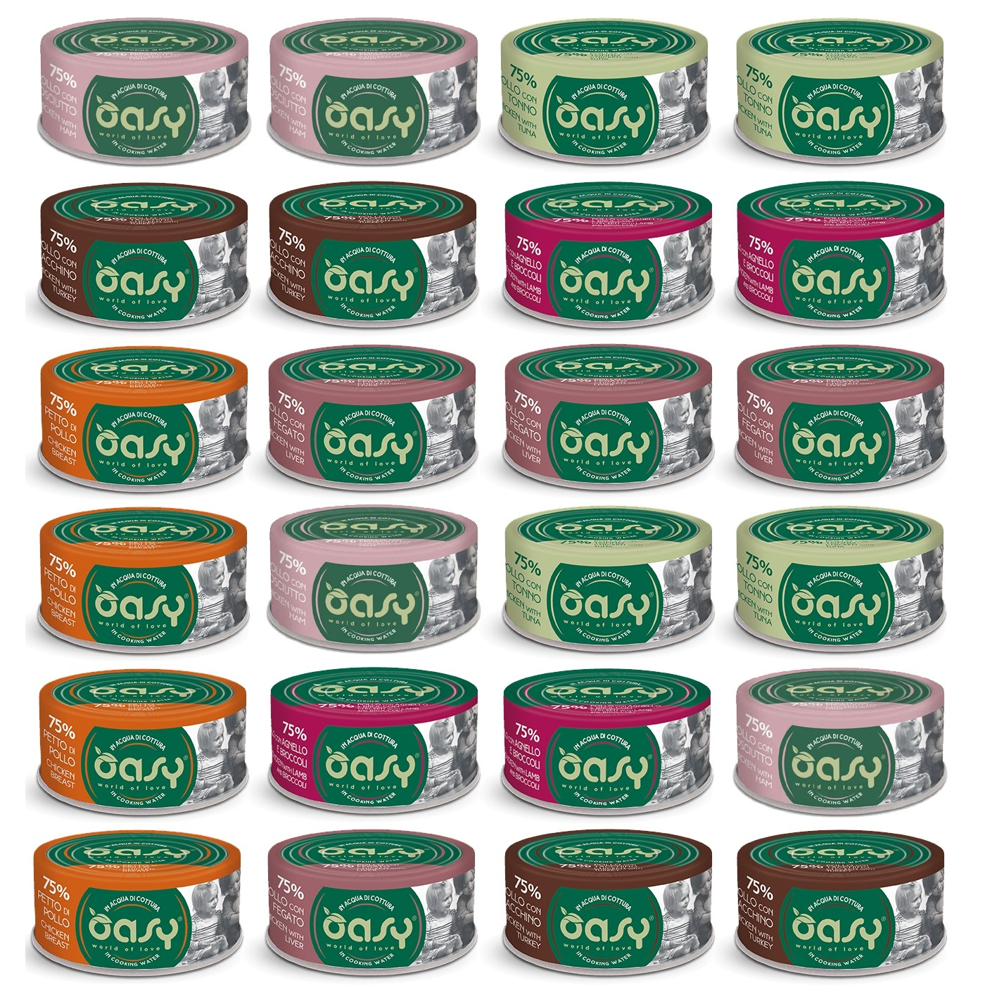 Zestaw Oasy More Love, Naturalna uzupełniająca karma mokra dla dorosłych kotów, Mix smaków, 24 puszki po 70g