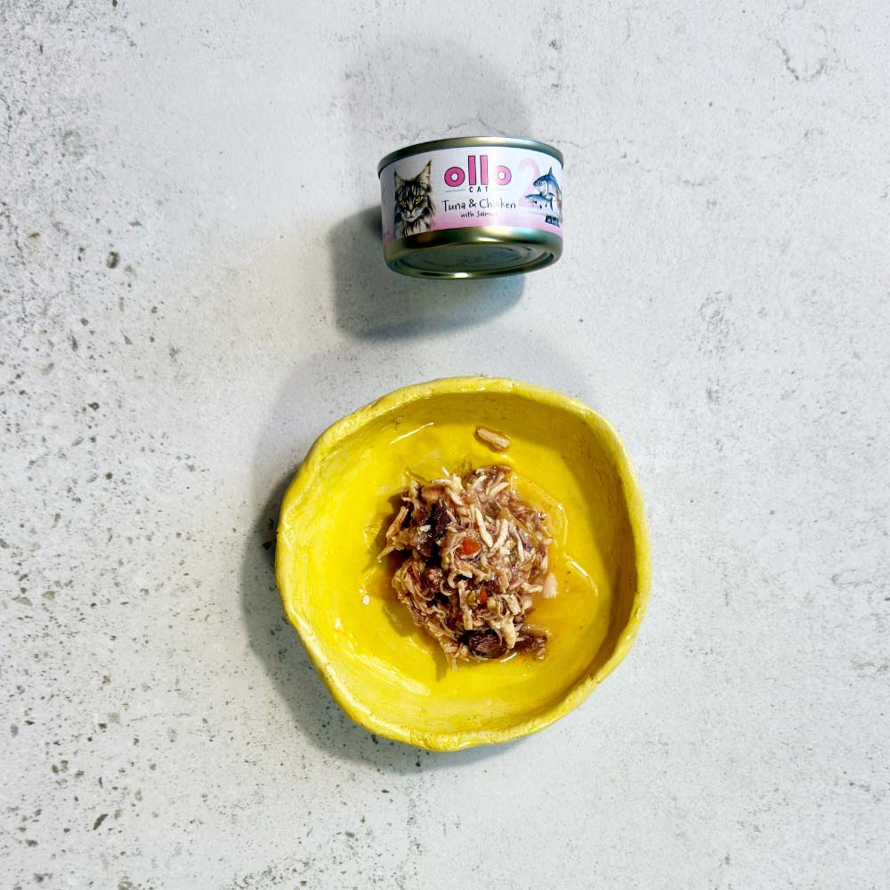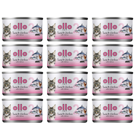 Ollo Cat nr 2 Tuńczyk i Kurczak z Łososiem, Karma mokra w bulionie dla kota, puszka 12x70g