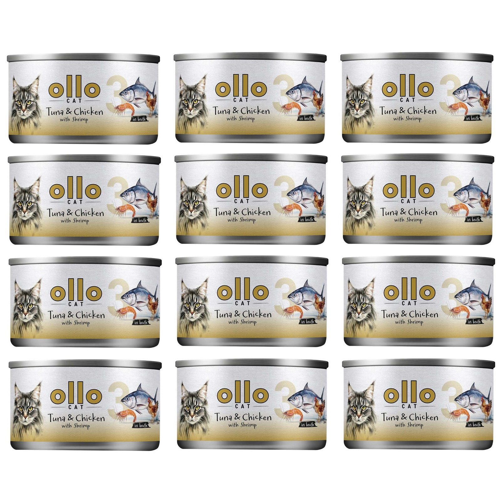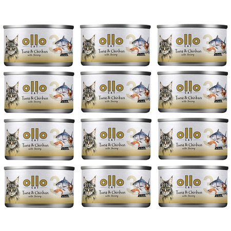Ollo nr 3 Tuńczyk i Kurczak z Krewetkami, Karma mokra w bulionie dla kota, puszka 12x70g