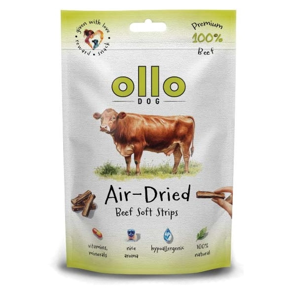 Przysmaki dla psa Ollo Air-Dried Beef Strips to naturalne, hipoalergiczne, monobiałkowe smaczki z Wołowiny – Zdrowie i Smak w Każdym Kęsie! Nagradzaj swojego psa zdrowo, a jedocześnie smacznie i dbaj o jego dobre samopoczucie. Ollo Air-Dried Beef Strips to wyjątkowe, delikatnie suszone paski z wołowiny. Zadowolą nawet najbardziej wybrednego psa i będą wsparciem dla jego zdrowia.