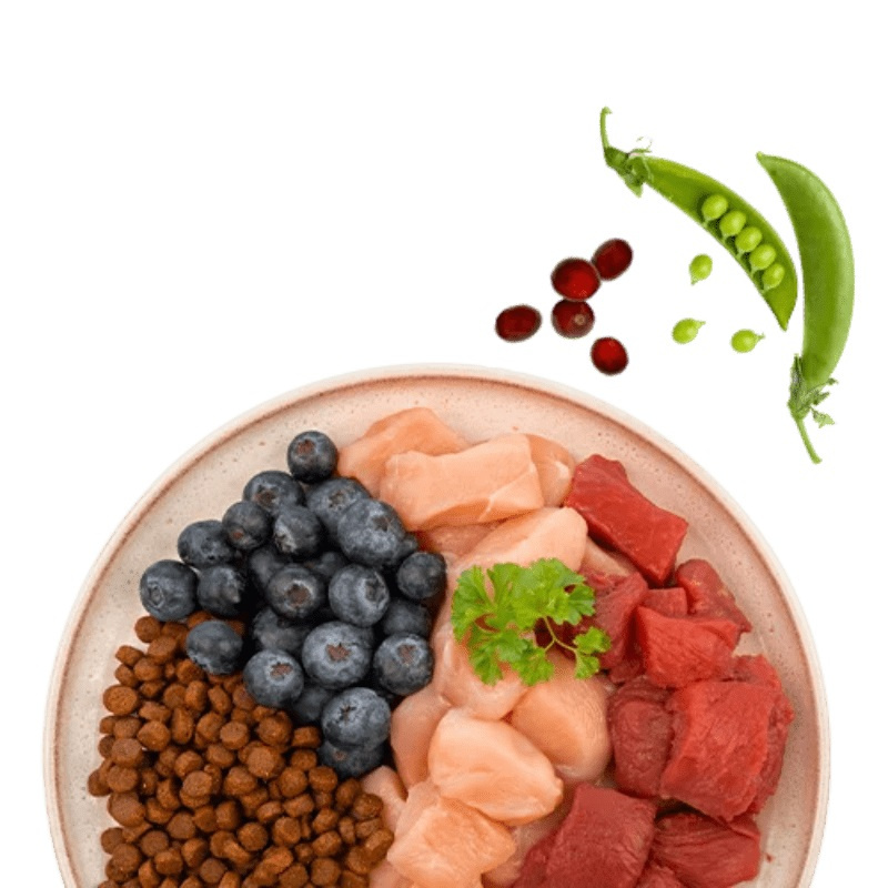 Skład: Świeże mięso z kurczaka (20%), jęczmień, kukurydza, skwarki (suszone), tłuszcz zwierzęcy, mąka ryżowa, białko drobiowe (suszone), białko kukurydziane, białko strusia (suszone, 4%), groch (suszony, 4%), hydrolizat białka, suszony miąższ buraczany (bez cukru), skrobia grochowa, mączka wątrobowa, węglan wapnia, olej z łososia (0,5%), chlorek potasu, borówki brusznice (suszone, 0,1%), borówki (suszone, 0,1%), suszona pietruszka (0,1%), drożdże (suszone, 0,1%), kwiaty nagietka (suszone, 0,05%).