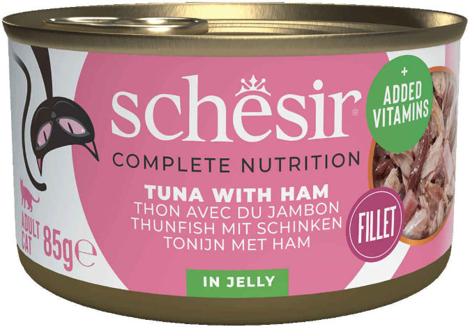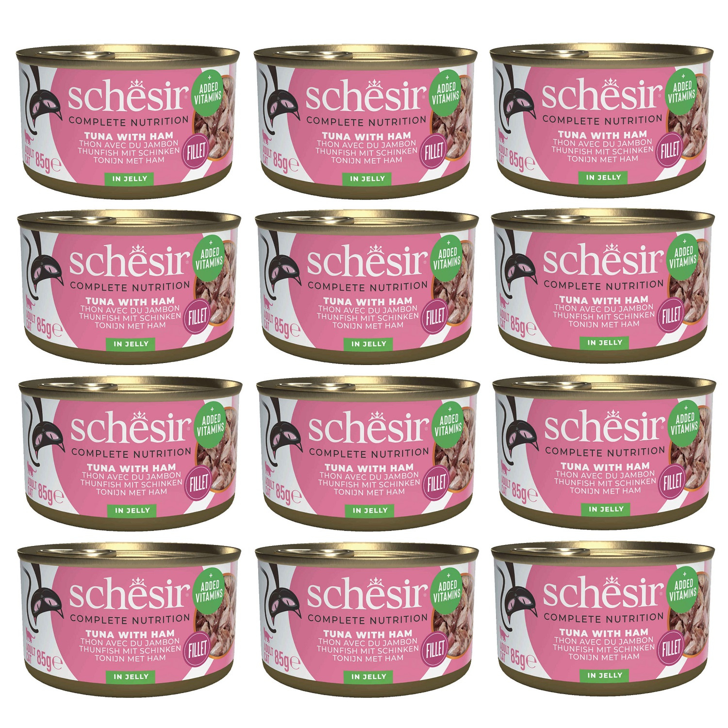 Zestaw Schesir, Pełnoporcjowa mokra karma w puszce dla kota, Tuńczyk i szynka w galaretce, 12x85g