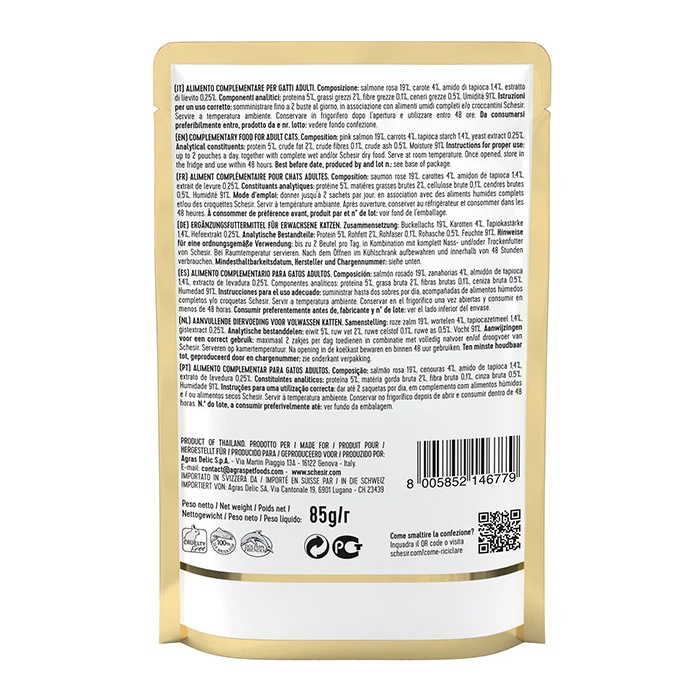 Karma w postaci zupy dla kotów, które uwielbiają mokrą karmę Schesir, a zwłaszcza jej bardziej płynne odmiany. Świetnie smakuje sama jako samodzielna porcja, a także doskonale nadaje się do podawania w połączeniu z karmą suchą dla uzyskania dodatkowego smaku.