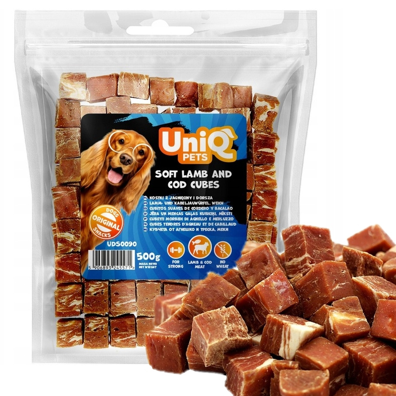 Uniq Pets, Miękkie Kostki z Jagnięciny i Dorsza, mięsne przysmaki dla psa, 500g
